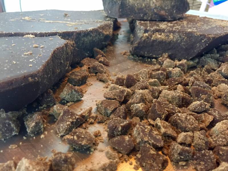 The branches crackled and crunched as the liquid cane sugar was extracted. A pamphlet I read said that “75 percent of the total weight of these branches is cane sugar, and fibrous residue makes up the remaining 25 percent.” Next the liquid sugarcane was boiled down so that impurities (lingering branch material) could be scuffed off. This juice then becomes a solid candy as it is poured into cool metal trays where it solidifies naturally. Tradition dictates that the brown sugar is cut into bite-size chunks and enjoyed with tea to relieve fatigue.