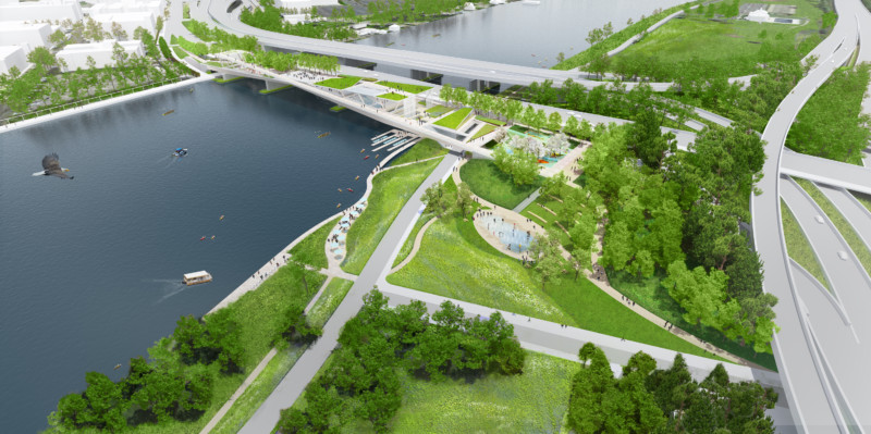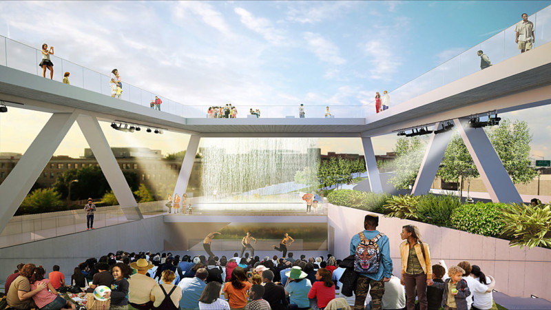 The 11th Street Bridge will span the two sides of the Anacostia River of D.C., the city’s first elevated public park. This recreational bridge, which will be the size of three-foot ball fields, will feature two levels for pedestrians to stroll and relax, as well as garden areas and open space, and waterfalls from the upper level to the first. The architectural plan was chosen through a competition with 40 submissions of proposals. The committee selected the proposal of a collaboration between the Netherlands-based firm Office of Metropolitan Architecture (OMA) and the Philadelphia-based Olin Studio in 2014. The structure is meant to connect the communities on each side of the banks, addressing the economic disparity between the two sides of the river. It and will also contain an amphitheater, hammocks. The park is projected to be open by the end of 2019, and pre-construction began last year.