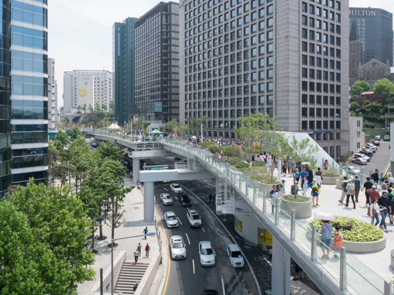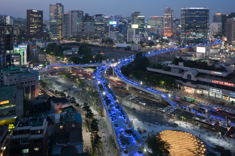 In April, the Seoul Skygarden opened on one of the city’s largest abandoned overpasses, a huge pedestrian walkway that weaves through the center of the city. Designed by the Dutch architecture firm MVRDV, the overpass supports a public garden with a path of 24,000 plants and trees organized alphabetically. At night, blue lights fill the whole overpass, wrapping around the hubs of plants that fill the space, so it’s, “as if you’re walking in a cosmos,” MVRDV co-founder Winy Maas said. In total, there are 645 tree pots on the overpass with around 228 species and subspecies. Bridges and stairs connect the overpass to shops and gardens.