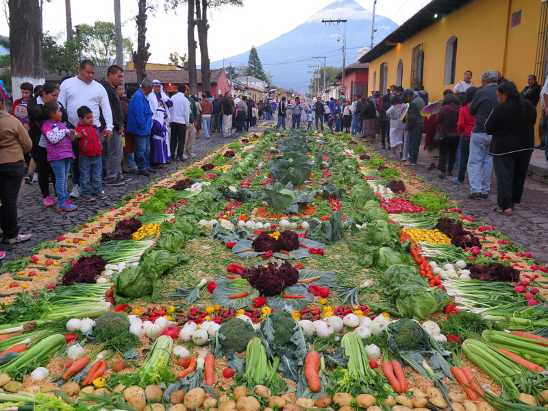 Every year during Holy Week, amazing carpets composed of flowers, vegetables, fruits and dyed sawdust adorn the streets of Antigua, Guatemala– a lovely Colonial city home to Latin America’s most famous Easter celebration.