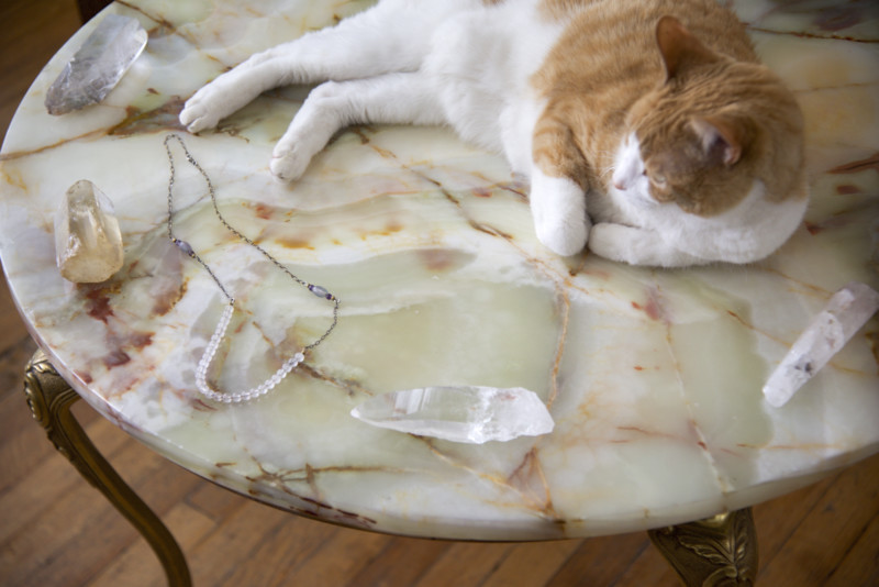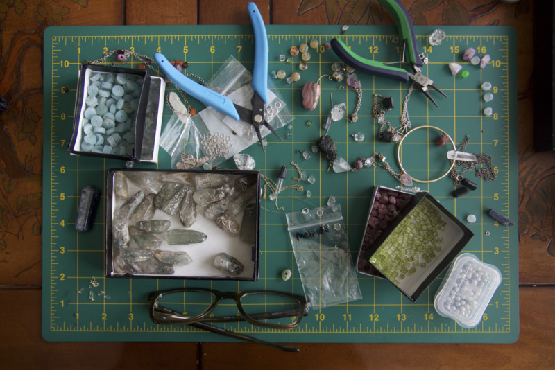 Today, these prescription adornments form the cornerstone of Holm’s work as an energy healer. “People come to me and I do tarot readings and have them interact with different mineral specimens, and then I make custom jewelry to assist them in whatever’s going on,” she says of the career that evolved from her openness and spiritual ingenuity. “We talk over aesthetics– because obviously I want to make something that they’ll wear– and I take notes. Then, they leave, and usually I’ll wait a day. I’ll give [the process] a little bit of space. Then, I’ll sit down in my studio, take out all of my stones, and make choices based on intuition.” Holms explains the process while wearing a prescription necklace that she made for herself– composed of Blue Apatite, emerald, rubies, white and pink sapphire, and other earth stones, it glimmers in the soft afternoon light.