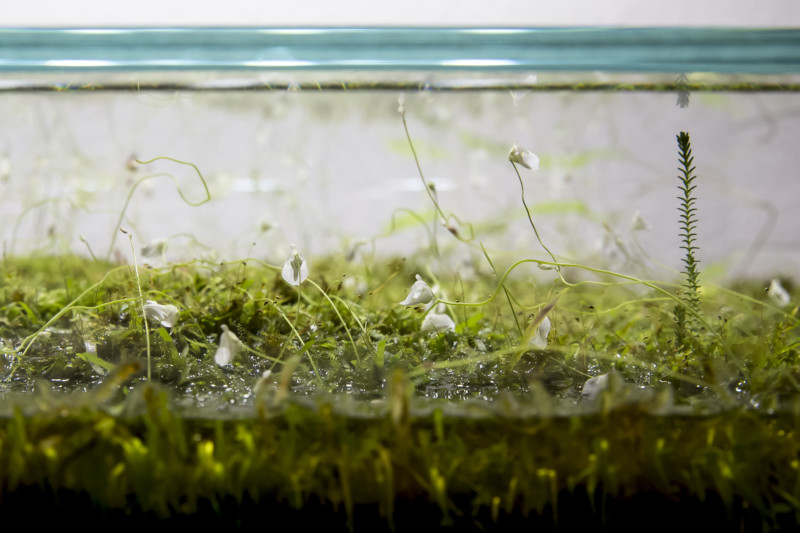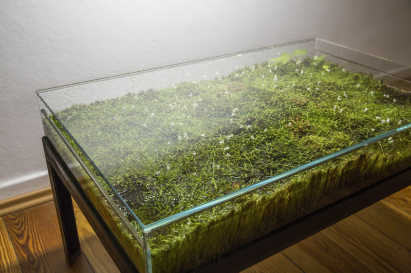 FV + MH: It took about one year to find the right plants that would fit in the table. We tested about 50 different species to find the right ones to cultivate. Besides moss, we wanted to cultivate little flowering plants to give the table a contrasting color that would change periodically [the flowering plants are utricularia, which bloom year-round]. Right now, we are very happy with our collection of different plants; costumers can choose between 25 different plants with very different flowers.