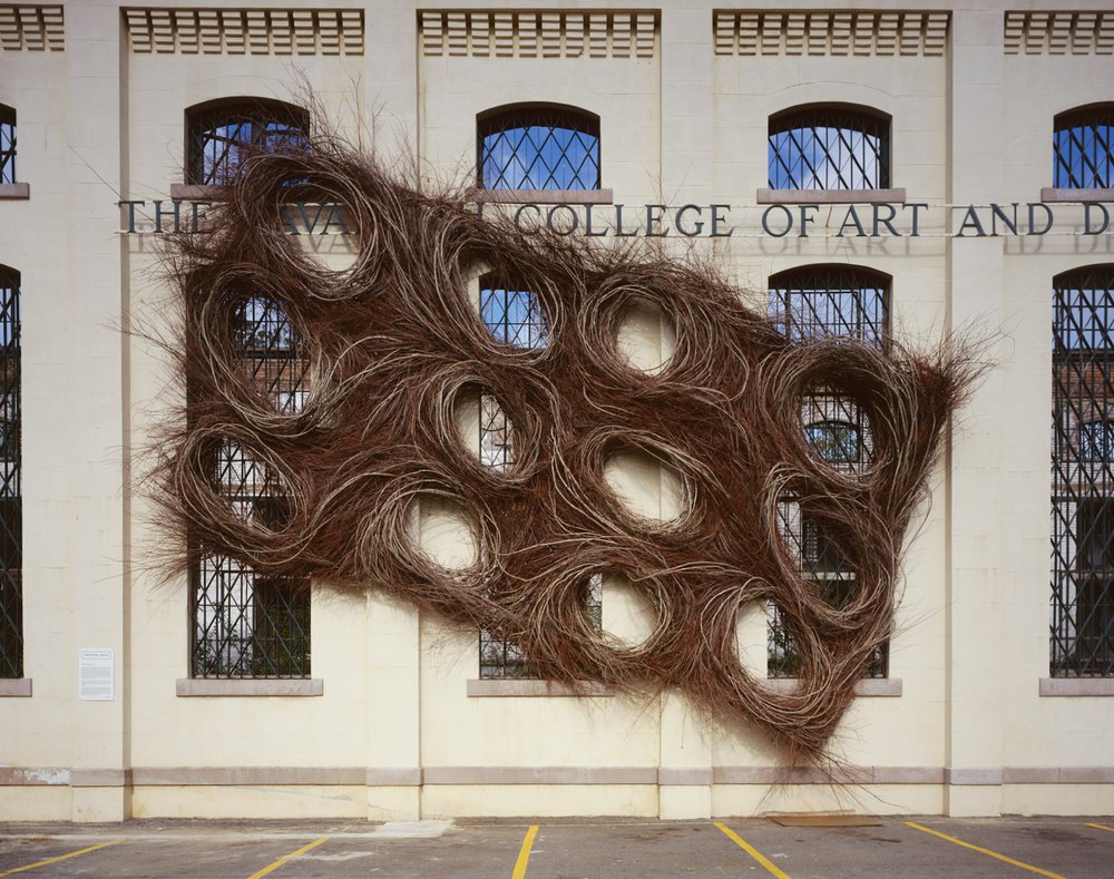 Photo: Courtesy of Patrick Dougherty In a loving marriage of carpentry and sculpture, Patrick Dougherty creates massive stick art installations that evoke giant tumbleweeds. His works– which have been featured around the world– have an ever-present sense of movement and are often constructed on such a massive scale that visitors can move through them, experiencing the space they create as well as the visual effect. Among his more impressive works are Cell Division at Savannah College of Art and Design (which took over an entire facade), and Just Around The Corner, in which Doughterty blended his art directly into Nature itself by weaving a series of shelters out of Earth materials.